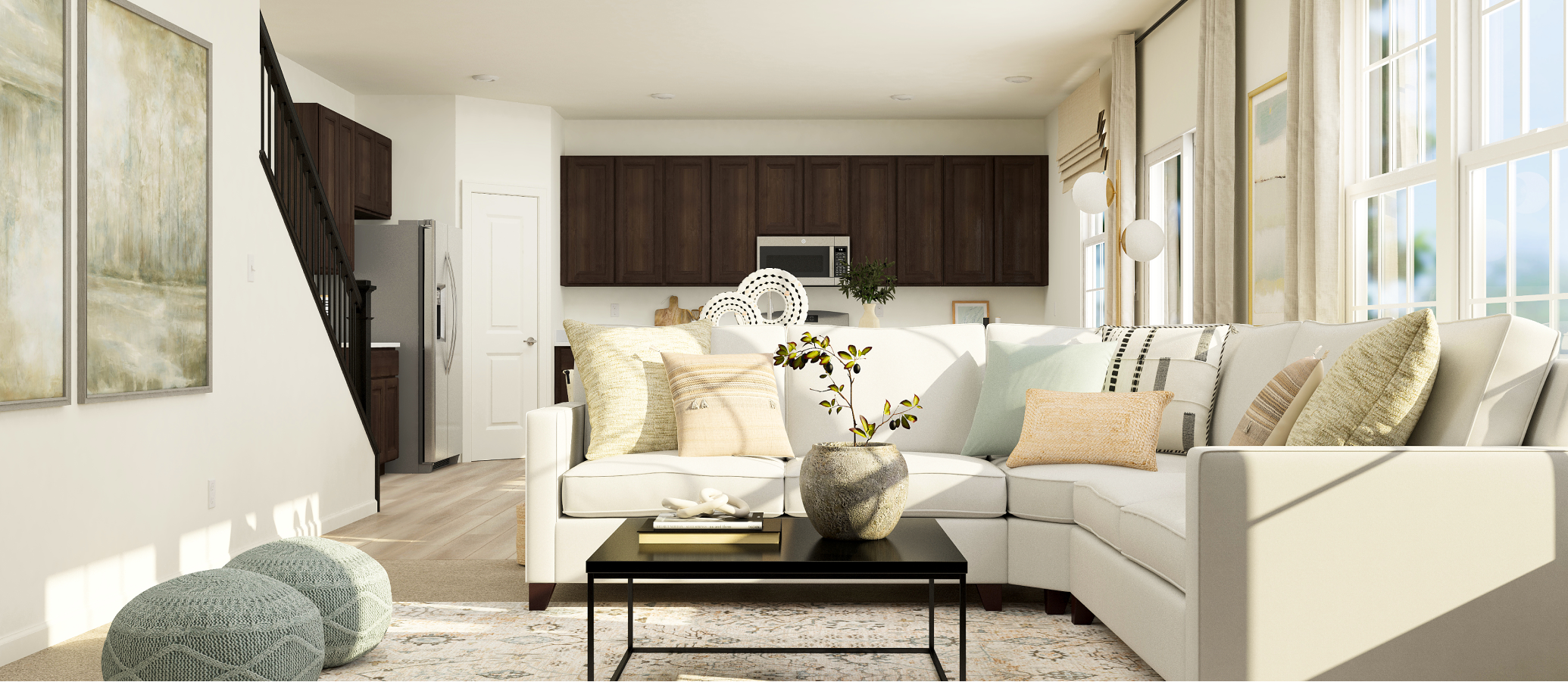 Shaw® luxury vinyl plank flooring runs throughout the living area, kitchen, dining room, foyer and other select parts of the home (per plan)